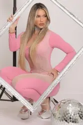 Black, blue, and pink long-sleeved jumpsuit with sheer tulle inserts on the front and sides, adorned with rhinestone appliqués that enhance the silhouette. A fitted and sophisticated design, ideal for evening occasions or events that call for a striking and elegant look.