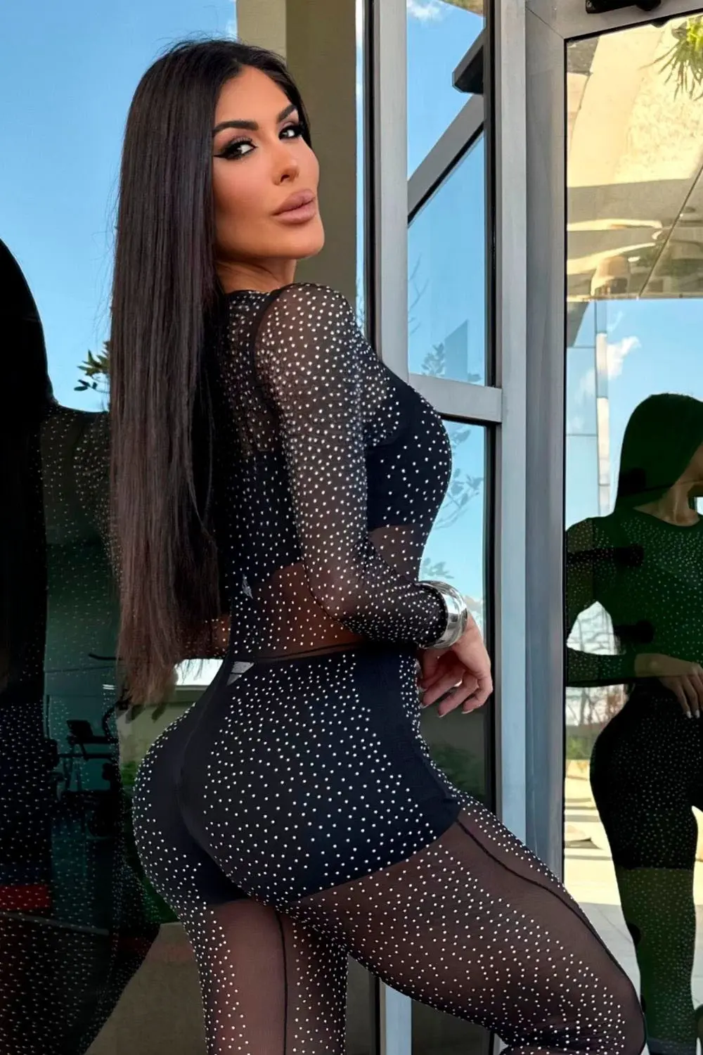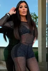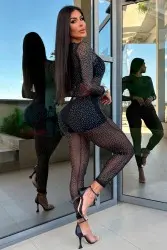 Long jumpsuit in sheer tulle with rhinestone appliqués, a fitted design, and strategic cutouts that accentuate your curves. A sophisticated and modern piece, perfect for bold and stylish looks.
