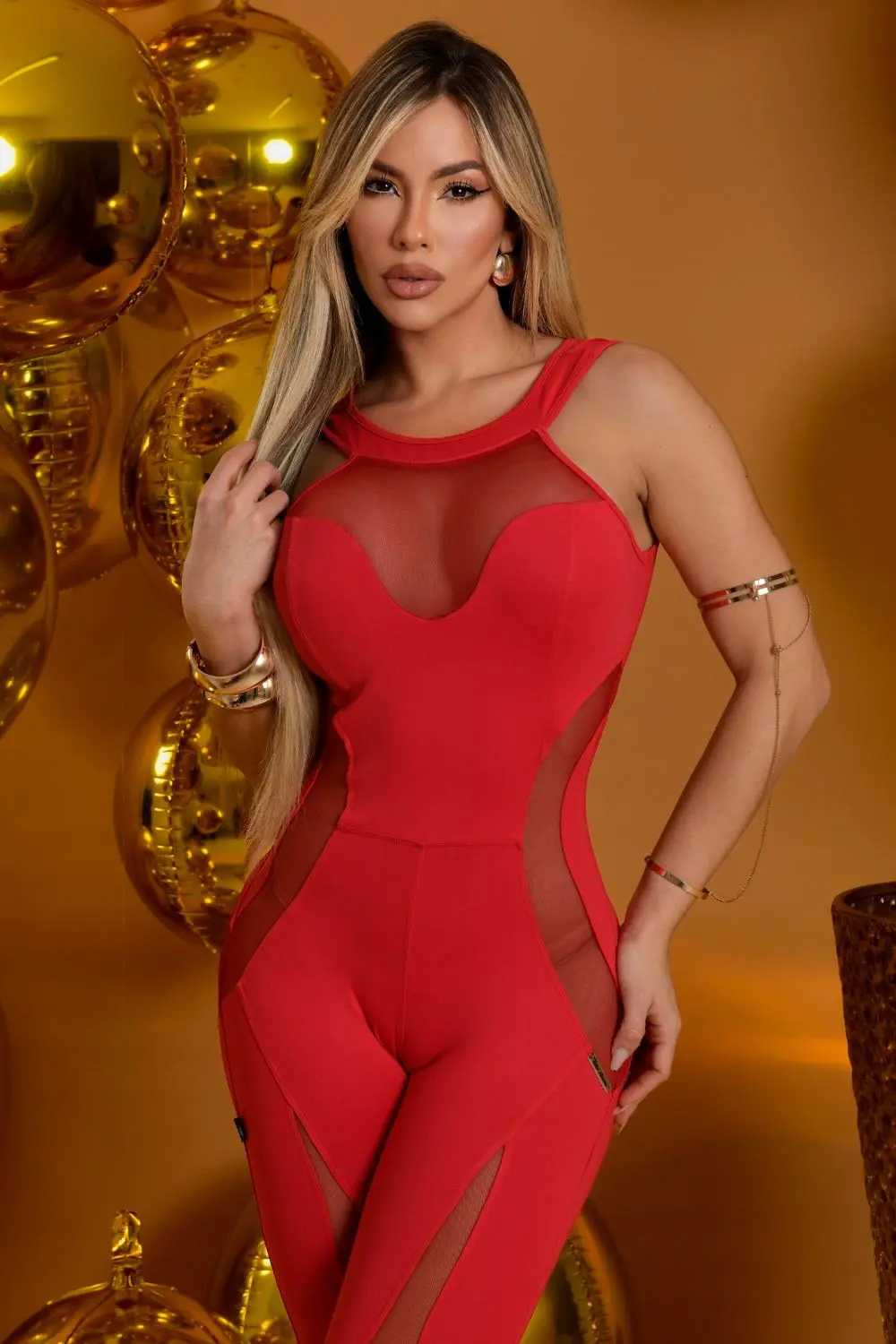 Jumpsuit with a fitted silhouette, strategic tulle cutouts, and a high neckline that elegantly flatters the body. The modern design elongates the silhouette and creates a striking look for evening wear.