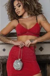 Unleash your fiery fashionista with our red set! This dynamic duo is all about making a bold statement. The front-only top hugs your curves in all the right places, while the shimmering shiny details add a touch of glam to your look. But that's not all – the skirt features playful decorative openings on the sides of the waist, showing just the right amount of skin to keep things intriguing.