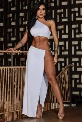 Features: A white set, composed of a top with a single thick shoulder strap and a long skirt with a wide decorative opening that shows off the right leg.