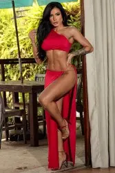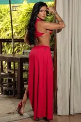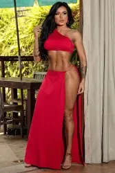 Features: A red set, composed of a top with a single thick shoulder strap and a long skirt with a wide decorative opening that shows off the right leg.