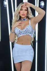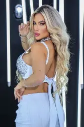 White fashion set with beaded top and tie at the back. On the bottom, a tight white mini skirt that shapes the body and accentuates the curves, giving it a lot of sensuality.