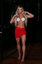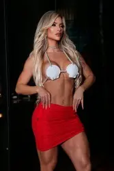 Super sensual fashion set consisting of a red mini skirt that leaves the legs exposed and adds even more sensuality to the look. The top is a bikini model with a shell shape on the bust, which gives the look a beachy vibe and evokes the image of a mermaid.