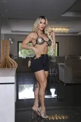 Lingerie-style top with sheer detailing and gold sequins, thin, tie-able straps for better support. Black high-waisted shorts with front zipper closure and gold chain details on the sides, adding a sophisticated and daring touch. Perfect for nighttime looks full of attitude and glamour.