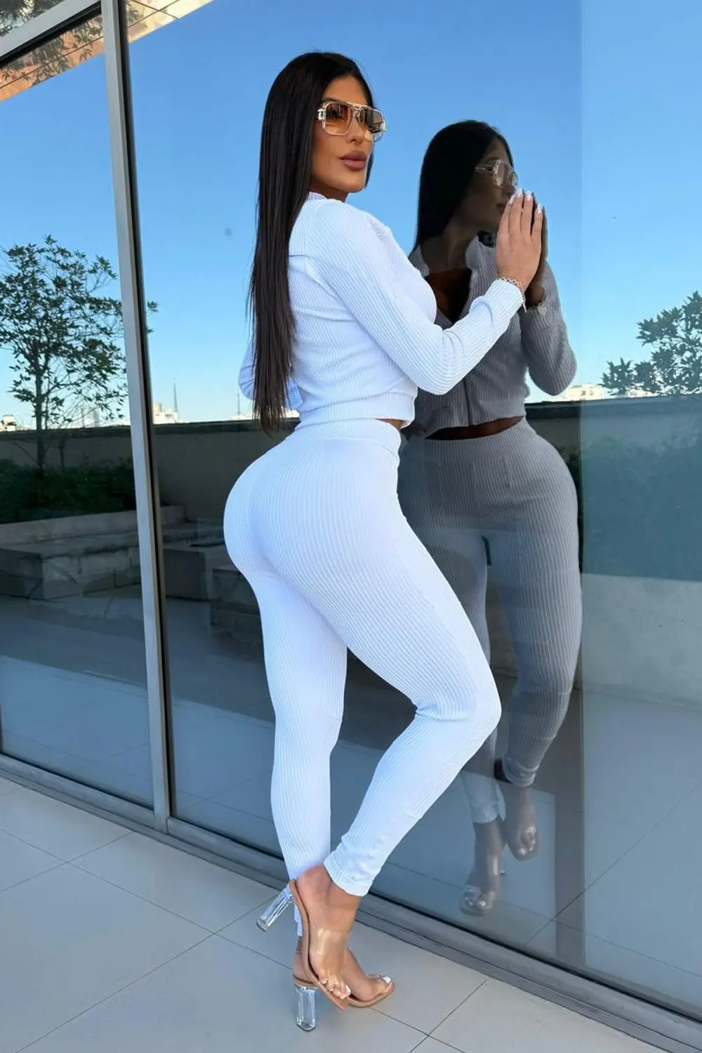 The set features two pieces in white ribbed fabric. The long-sleeved top features a front zipper, a V-neckline, and a cropped length. The pants are high-waisted and form-fitting. The design is contemporary and versatile, ideal for a casual yet elegant look.