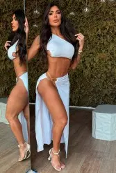 Features: White set consisting of a top with a single thick strap and a long skirt with a wide decorative slit that shows off your right leg.