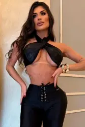 Fashionable set consisting of a twisted top with an ultra-sensual front cutout and high-waisted skinny pants with eyelet ties. Made from a fabric with a subtle sheen, it shapes the body with attitude and boldness. Ideal for evening events, parties, or statement looks.