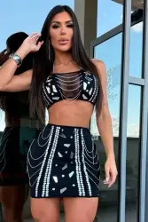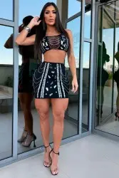 Black set consisting of a top and a fitted skirt, both with mirrored appliqués and metallic chains that add shine and sophistication. Perfect for bold and striking looks on evening occasions.