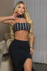 Black ensemble consisting of a structured strapless top with metallic details and an asymmetrical skirt with a side slit. The fitted style accentuates your curves, ideal for evening looks with attitude and sophistication.