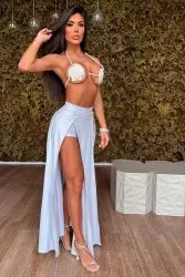 Modern white set consisting of a top with a tie back that enhances the bust and ensures a perfect fit. The long skirt features a striking slit and shorts underneath, combining lightness, comfort, and an elegant look. Ideal for sophisticated and stylish outfits.