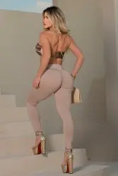 A modern and sophisticated ensemble, featuring a structured top in earthy tones with a central cutout and a glossy finish, paired with high-waisted nude trousers that flatter the curves and offer a perfect fit.