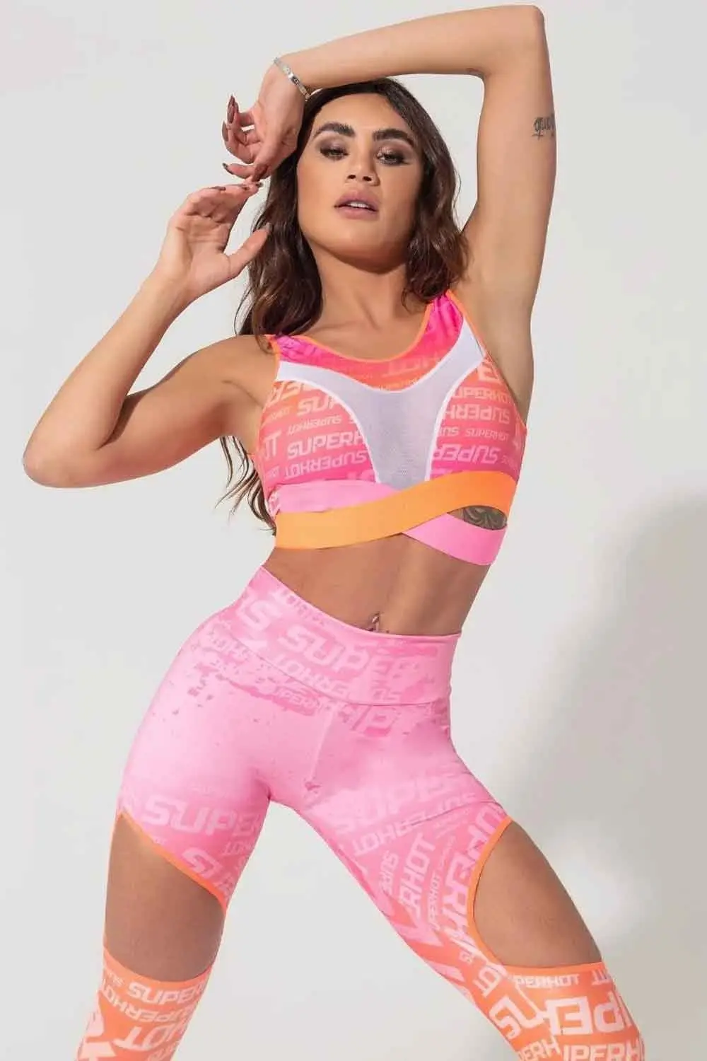 Features: Off-the-shoulder tank top and bust neckline in white tulle, U-neck and crossover waistband in neon orange and pink elastic. It does not have a bulge.
