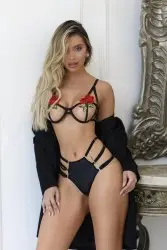 Features: Black set composed of a bra with rim and rose appliqués on the breasts, and a semi-thong panties with adjustable straps on the sides.