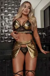 Features: It is a piece inspired by Queen Cleopatra, all in Lamê fabric, with a lace base composed of a detail with golden elastic and also has a strappy on the bust. The panties are model thong, with strappy braided straps, which enhances the female body even more, accompanying a skirt inspired by Ancient Egypt, also including the braided persexy to further highlight the piece. Inclued Bra + Panties + Skirt + Persexy pair.