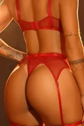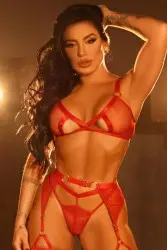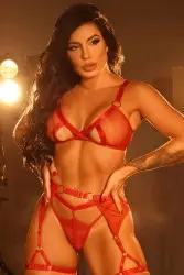 Features: Red lingerie set composed of a bra with decorative cutouts under the breasts, panties with multiple straps and a garterbelt.