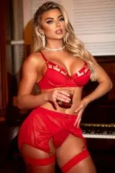 Features: A red lingerie set, composed of a bra with decorative straps over the bust, pair of panties, a garterbelt and a small revealing skirt bound by small rings.