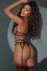 Features: A sensual black set made adorned with screens of fishnet fabric, composed of a cropped lingerie top with decorative openings, panties with a multiple strap design and an additional garterbelt.