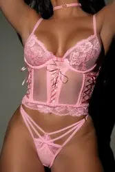 Imagine yourself wrapped in a tulle and lace crop top, with satin ribbon details, accompanied by string panties, both with adjustments. It's the sexy lingerie you need to feel confident and irresistible.