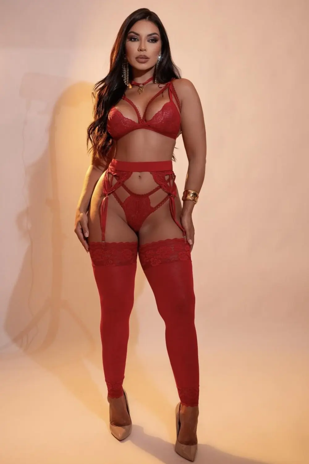 Vibrant red lace lingerie set, consisting of a triangular bra with sensual straps, thong panties with bold cutouts and a garter belt crafted in detailed lace. A striking model that enhances femininity with attitude and sophistication, ideal for special occasions where seduction is the protagonist.