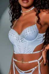 Cropped top in ciré fabric with adjustable strap detail on the side. Cups with cascading rhinestone detail and rhinestone straps. Panties with front cutout and rhinestones on the sides.