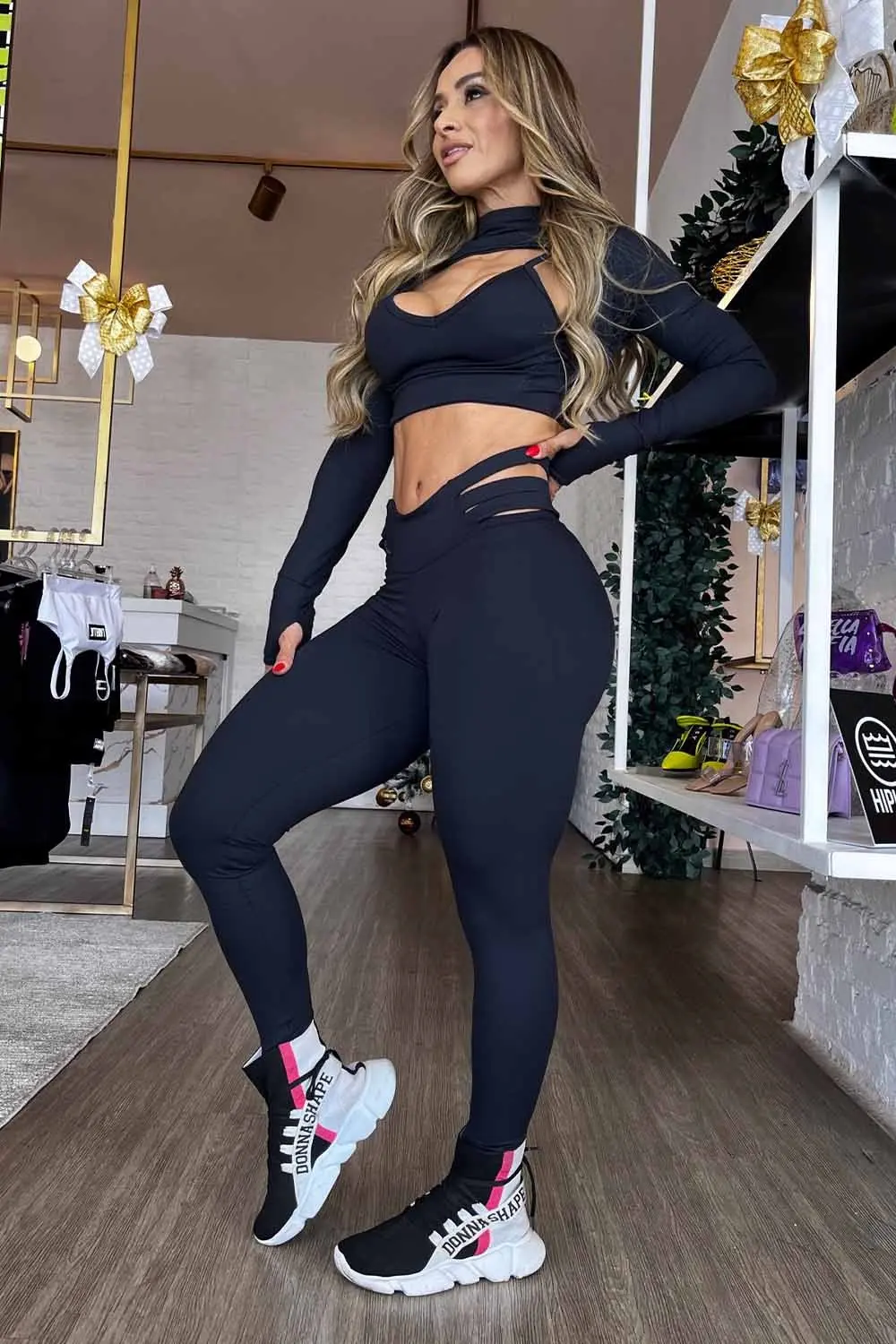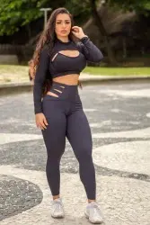 Features: Set consisting of a basic black top, black sleeves with a thimble, high-waisted leggings with side straps and a butt lift.