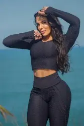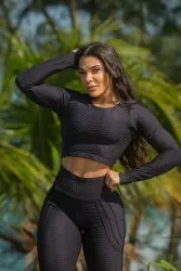 Features: black textured fitness set consisting of leggings and a long-sleeved crop top