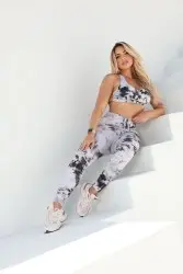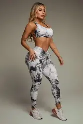 Long black and white tie-dye set with body-hugging fabric. The leggings have a high waistband with ties, which provides firmness and security and lifts the butt. The top has medium straps with an open back and designed in a racerback shape, bringing more charm and delicacy to the look.