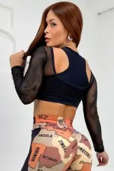 This fitness set features a black top with strategic cutouts and long tulle sleeves, offering a modern and sophisticated look with a touch of sensuality. The high-waisted leggings feature a world map print with a focus on the African continent, creating a unique and authentic design. Made from high-compression fabric, they provide support and comfort during workouts, while also flattering your figure with style. Ideal for those seeking performance combined with attitude.