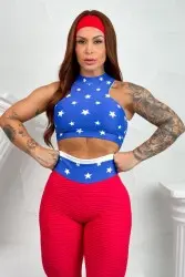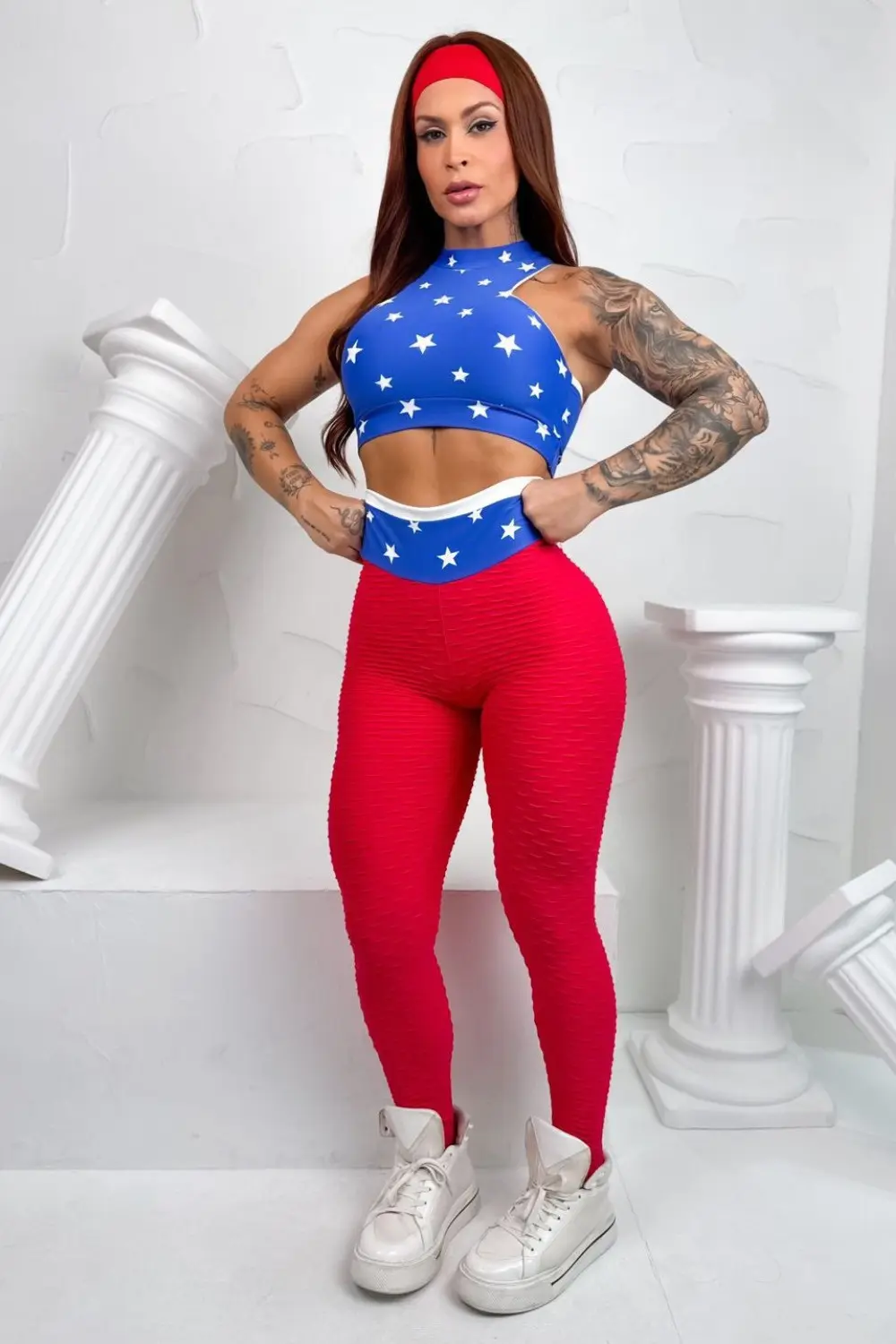 American flag-inspired fitness set with a high-support blue top with a star print and textured red leggings that enhance your curves and ensure comfort during workouts.