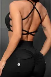 Black fitness set featuring a top with crisscross straps and side cutouts, accentuating your curves with style and support. The shorts shape the body with a high waist and functional back pockets, combining practicality and sophistication for your workouts or casual looks. Ideal for those seeking performance with a modern design.