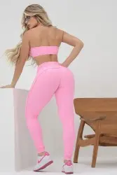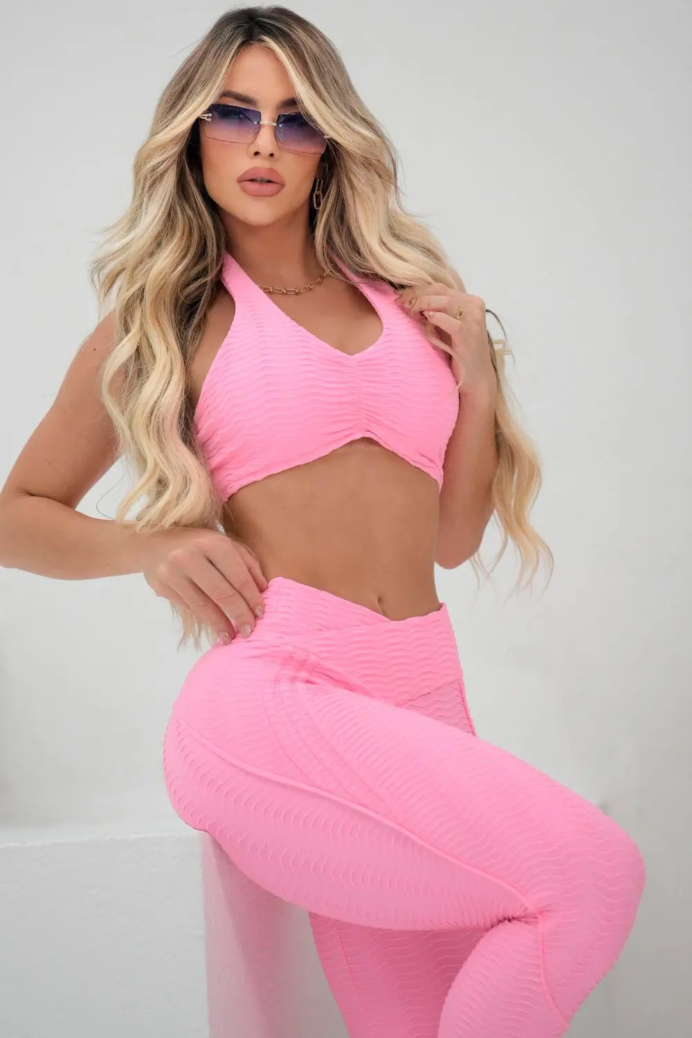 Pink fitness set consisting of a top and high-waisted leggings. The brocade fabric offers a sophisticated texture, high compression, and a shaping effect, enhancing the silhouette with comfort. Ideal for workouts and casual looks with a touch of style.
