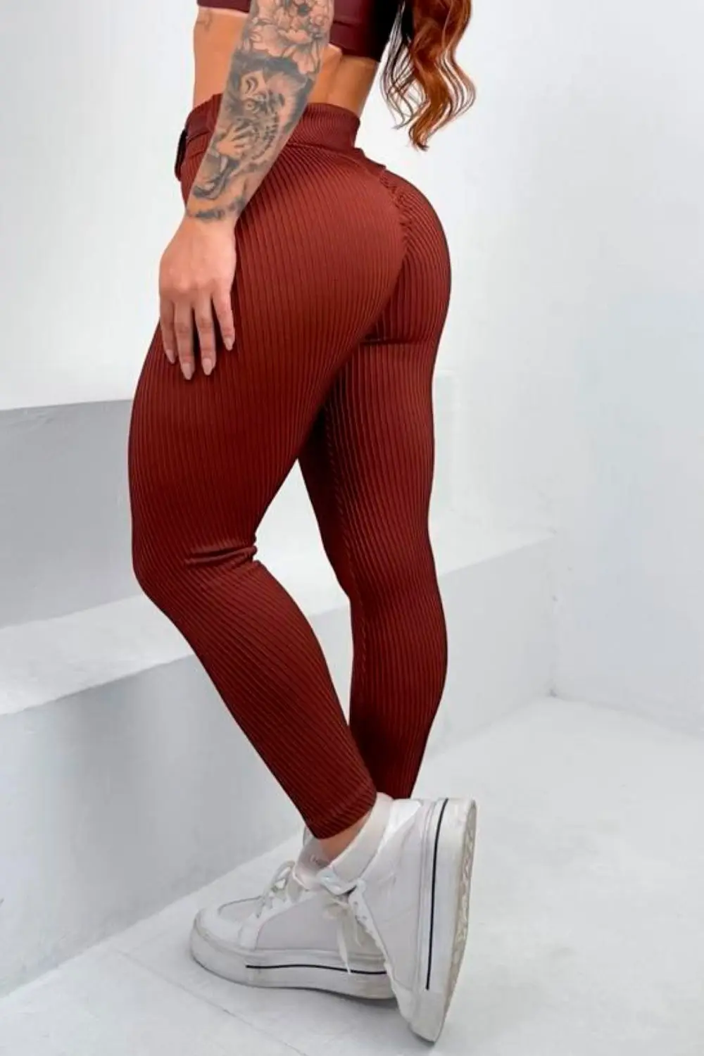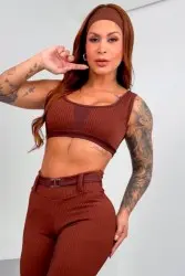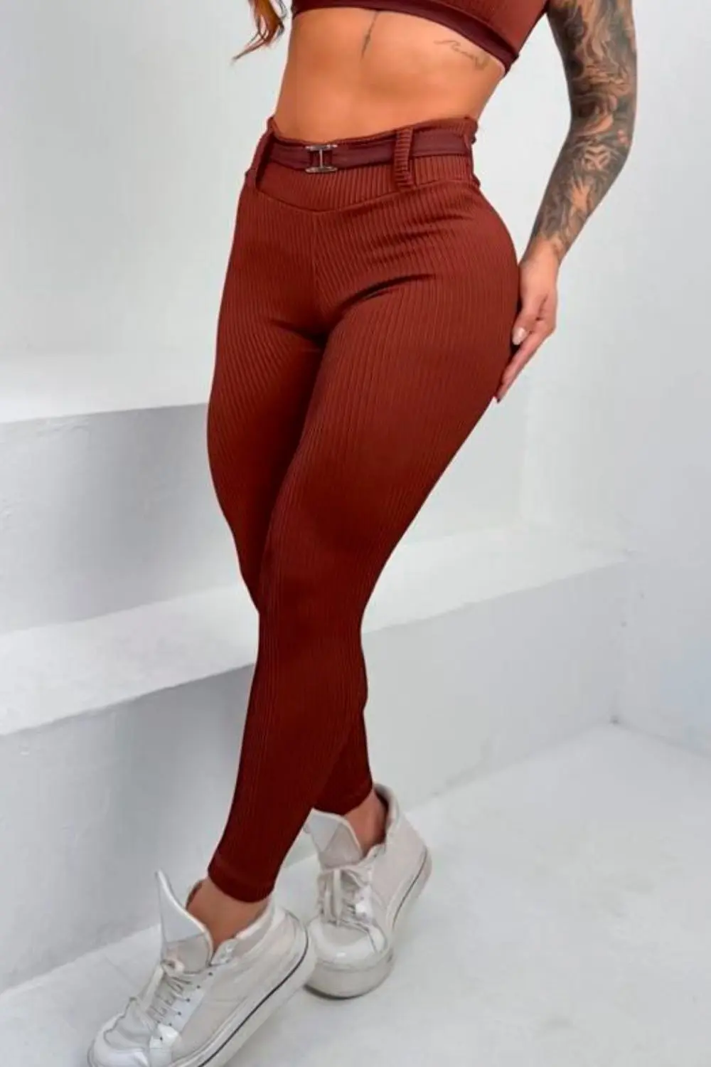 Brown ribbed fitness set, consisting of a structured top and high-waisted leggings with a built-in belt. This flattering design combines elegance and comfort for everyday wear or workouts.
