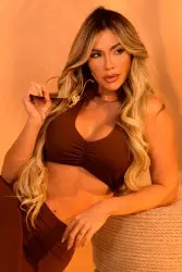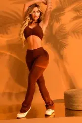 Flare fitness set made of high-compression fabric, which enhances curves and ensures comfort. The top features a halter neckline with central ruffles and excellent support, while the flare pants shape the body and elongate the silhouette. Ideal for workouts or stylish casual outfits.