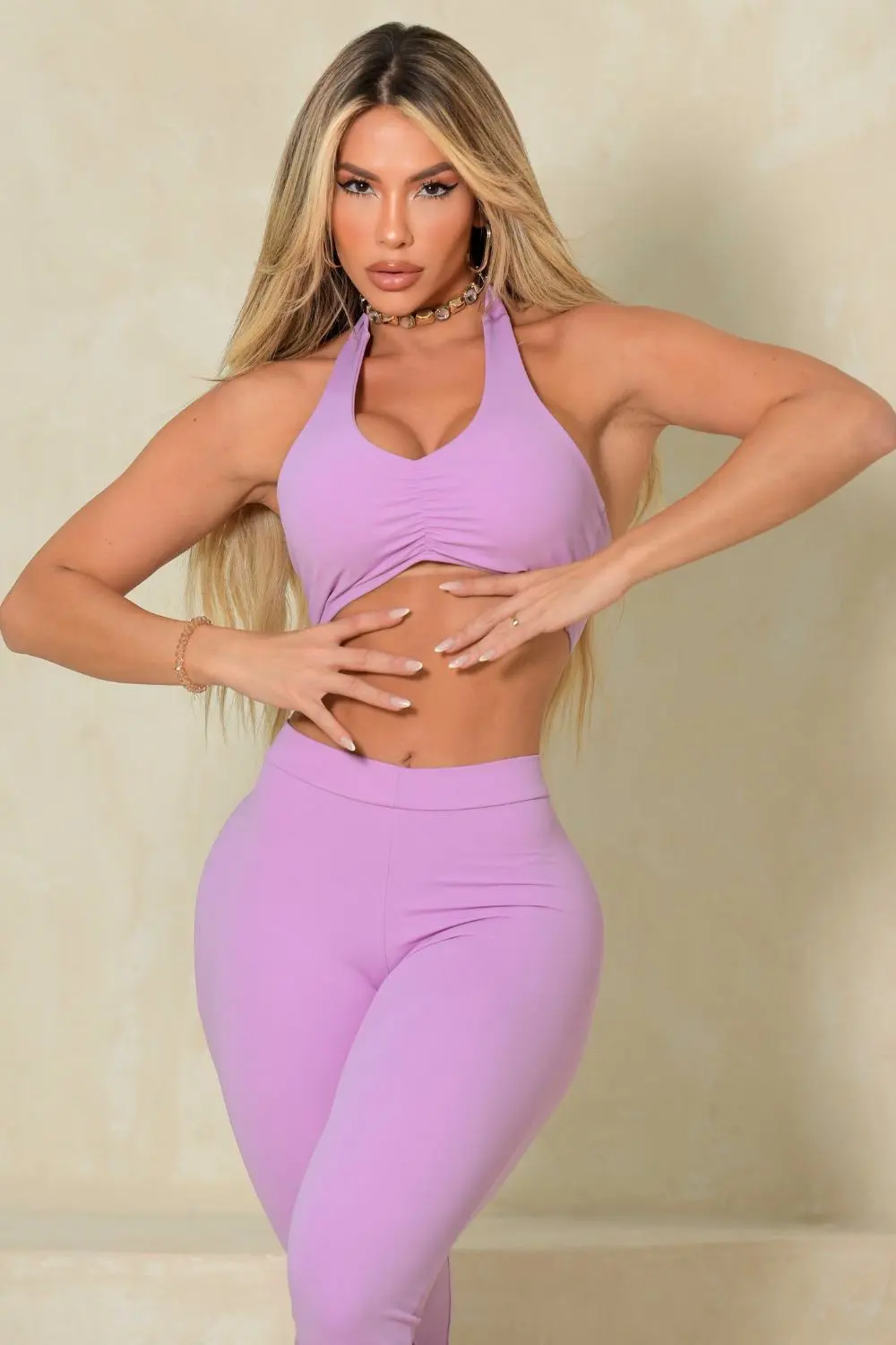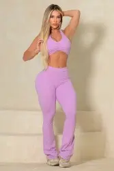 Flare fitness set made of high-compression fabric, which enhances curves and ensures comfort. The top features a halter neckline with central ruffles and excellent support, while the flare pants shape the body and elongate the silhouette. Ideal for workouts or stylish casual outfits.