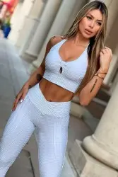 Features: Textured fitness set consisting of leggings and a one-shoulder top.