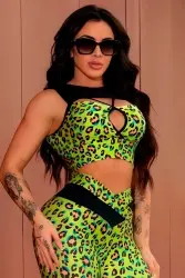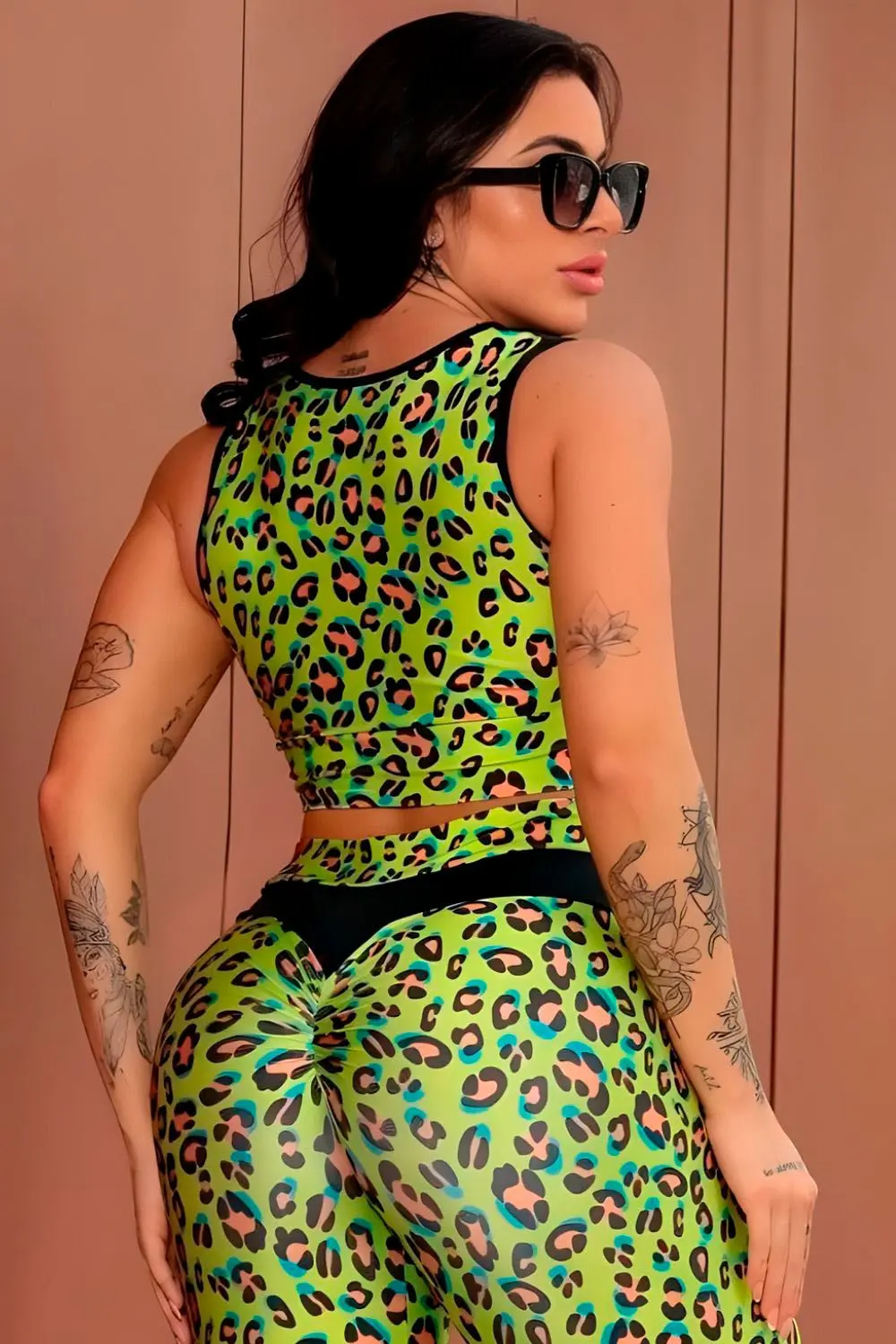 Matching set with a cropped top featuring a fitted silhouette, front cutout, and animal print, guaranteeing a modern and striking look. The high-waisted leggings match the print, offering a comfortable fit, good support, and freedom of movement. Ideal for outfits full of attitude and style.