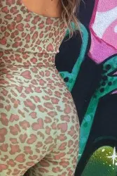 Leopard print shorts in shades of green and brown, Bermuda style, longer and high-waisted.