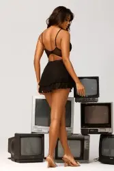 Black tulle nightgown with structured cups and lace detailing on the bust. It has front tie-up cutouts that enhance the silhouette, as well as a skirt with layered ruffles that ensure lightness and sensuality to the look. The straps are thin and adjustable, providing a better fit to the body. Ideal for those seeking comfort combined with elegance and boldness.
