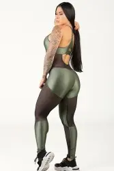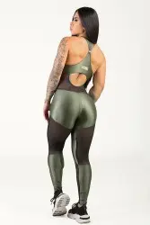 Olive green fitness jumpsuit with fishnet details, V-neckline and light opening in the back also with fishnet. Super comfortable and stylish, ideal for workouts with a modern touch.