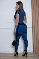 Fitted and elegant jumpsuit with a modern design that combines short sleeves, front zipper and shiny fabric details in strategic areas, such as the shoulders and legs. The piece enhances the silhouette, offering sophistication and athletic style, perfect for casual or sporty occasions.