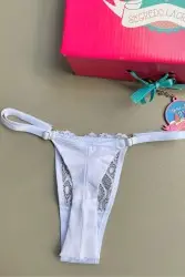 Delicate white panties with gold details, made of lace with a light thread on the back.