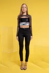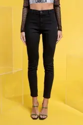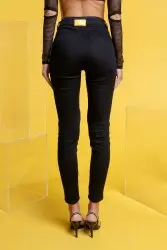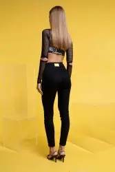 Features: Pants made of black jeans, with a cutout on the back that enhances the butt. It has fake front pockets and back pockets. With button closure and front zipper. It has yellow rubber plate on the back.