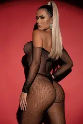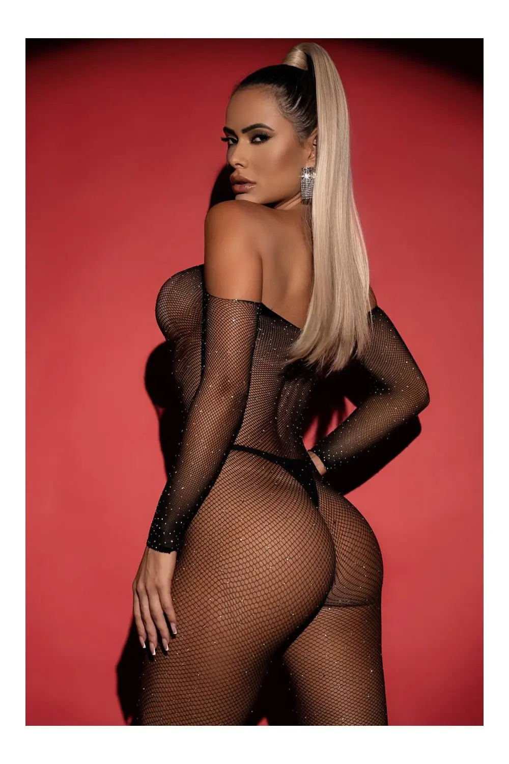 Jumpsuit in transparent tulle with microcrystal appliqués, full modeling and long sleeves. The piece combines sensuality and shine in the right measure, with an off-the-shoulder neckline and strategic cutouts that enhance curves. Ideal for nighttime occasions or bold looks with attitude.