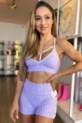 Gear up for your fitness journey with our vibrant and energetic fitness set! This eye-catching set includes a trendy necklined cropped top and a pair of shorts that are as stylish as they are functional. The standout feature? A playful plattered lilac pattern that adds a pop of color to your workout ensemble.