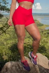 Features: Red texturized fitness set, composed of a low cut cropped top with a decorative opening over the bust as well as an asymmetric single shoulder strap, and a pair of shorts with a high waistline.
