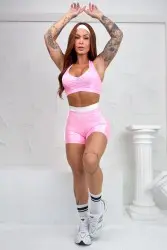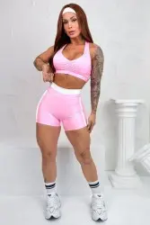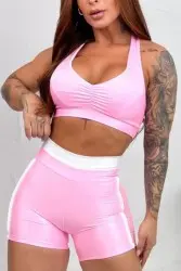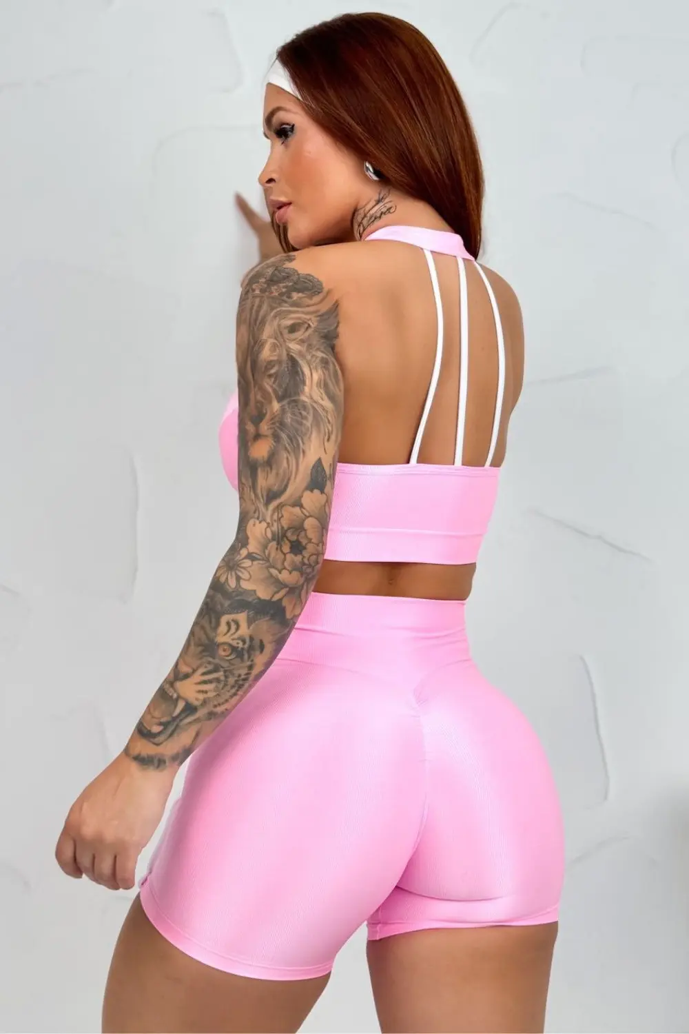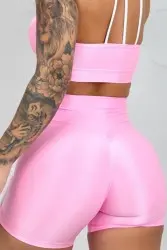 This vibrant pink fitness set offers a modern and functional design. The top features double straps in the back for added support and a bust-flattering neckline, while the high-waisted shorts feature white accents on the sides, creating a sporty yet elegant style. The fabric, with a slight sheen and subtle texture, provides comfort and a figure-flattering fit, making it ideal for workouts and physical activities.