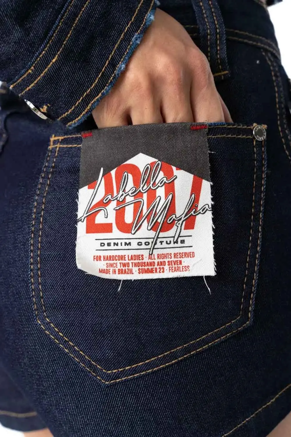 Women's denim shorts, hot pants style, with a high waist that enhances the silhouette. It has a dark wash for an elegant and versatile look, ideal for different combinations. Embroidered detail on the front adds a touch of style and authenticity. Zipper and button closure, with functional front and back pockets. Comfortable and modern, perfect for creating casual or more elaborate looks, depending on the combination with accessories and shoes.