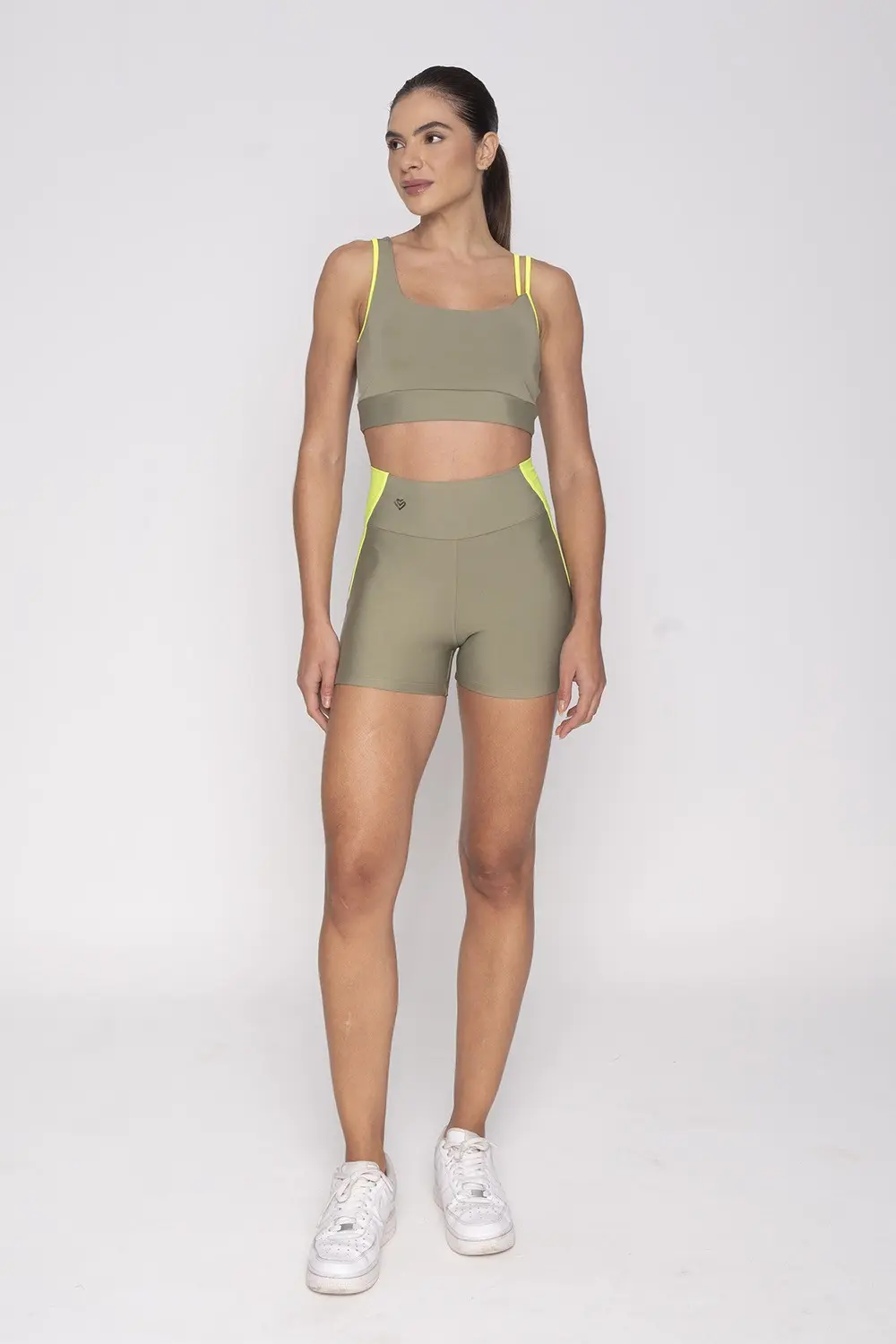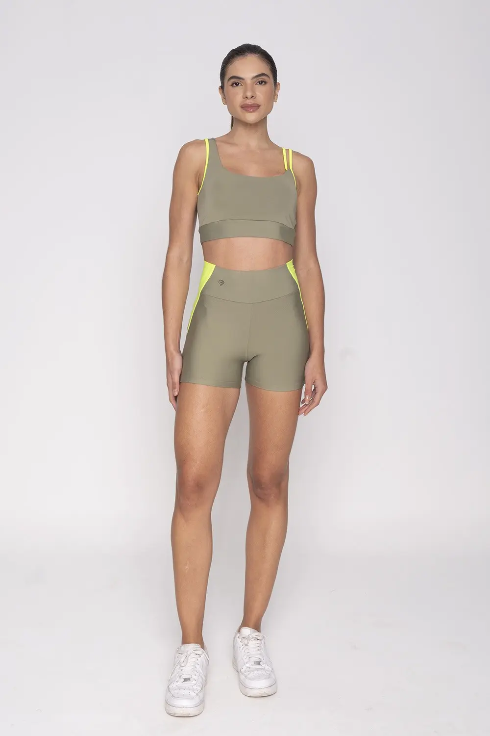 Military green fitness shorts with neon green details on the sides, bringing a cool and modern touch to the look. The fabric adapts perfectly to the body and allows freedom of movement, making it perfect for sports occasions.