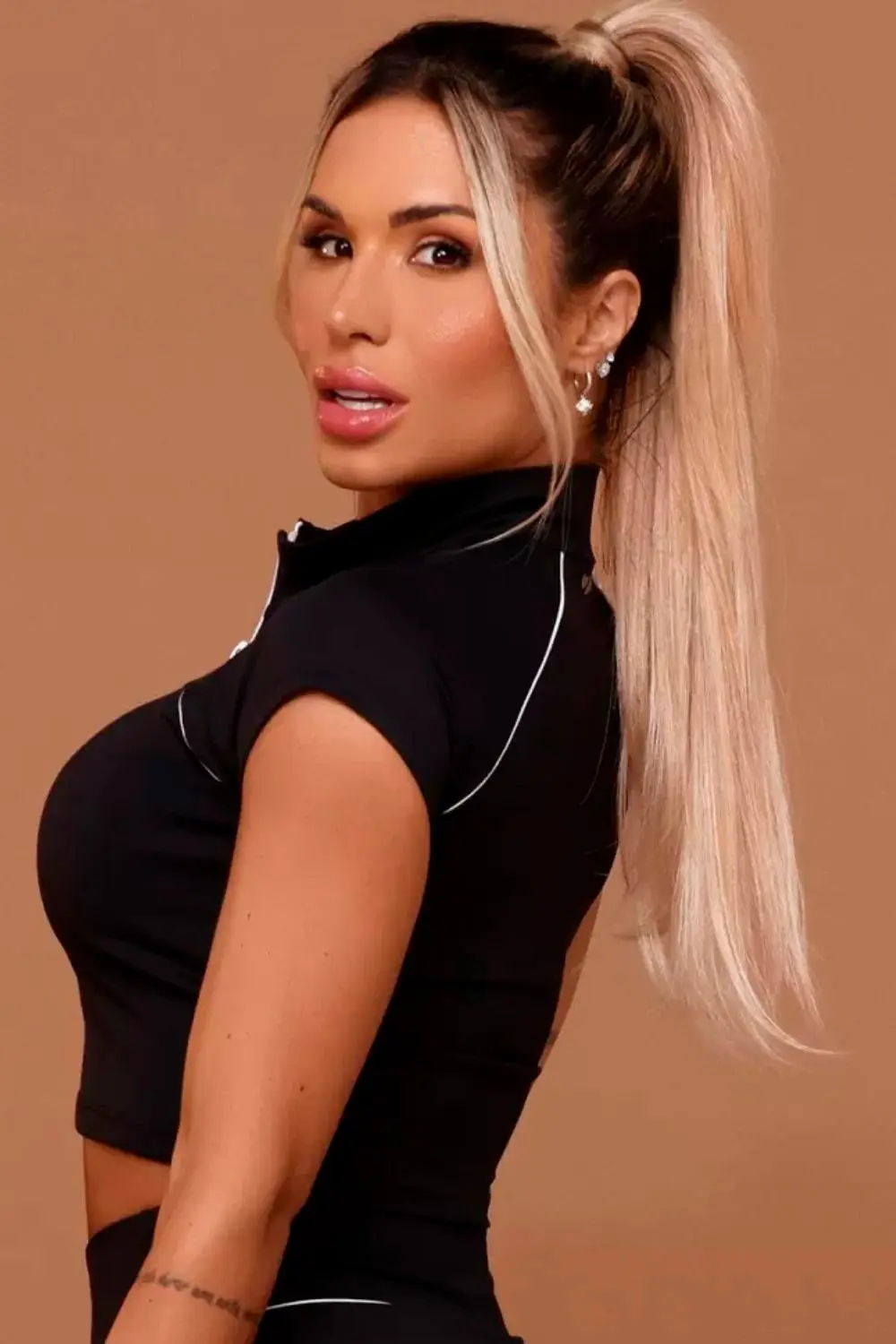 Black cropped top with a front zipper. Fitted to the body, with white detailing that adds a sporty touch. Ideal for creating modern and comfortable fitness looks.